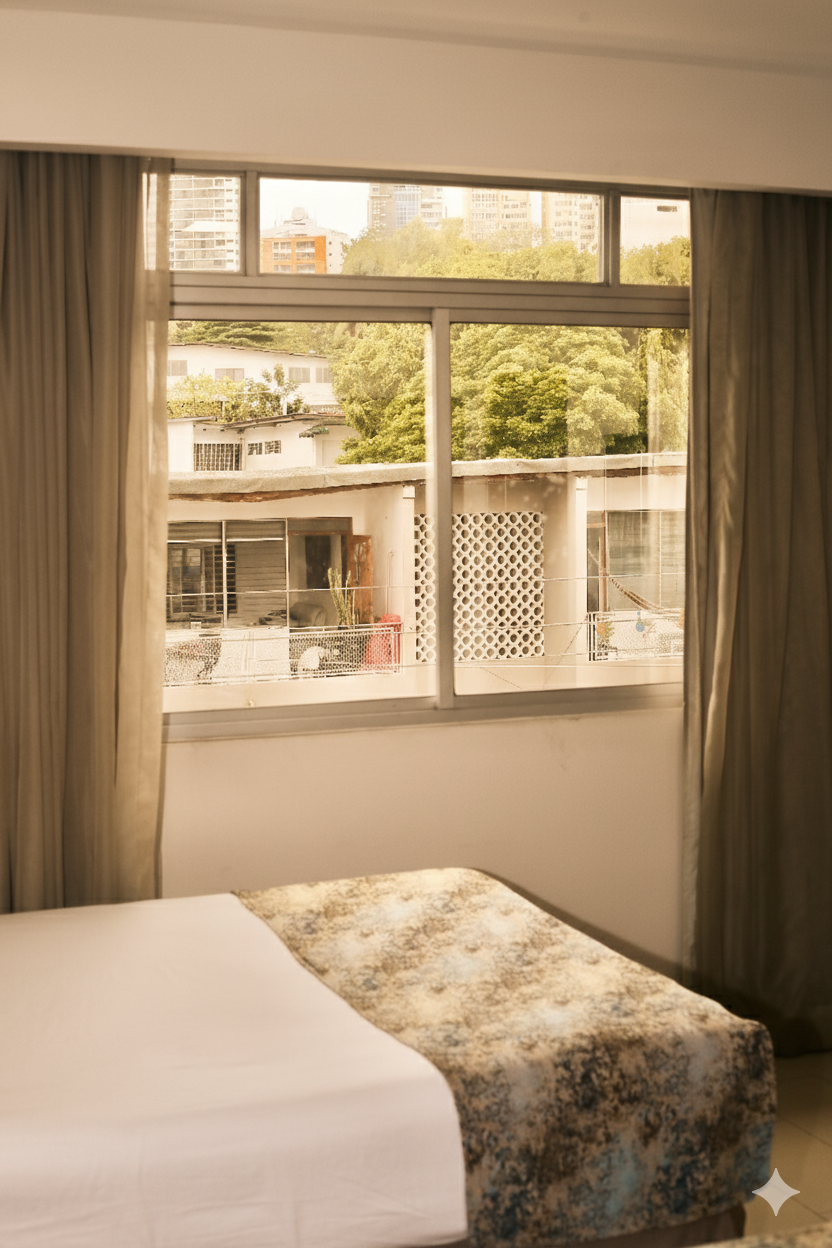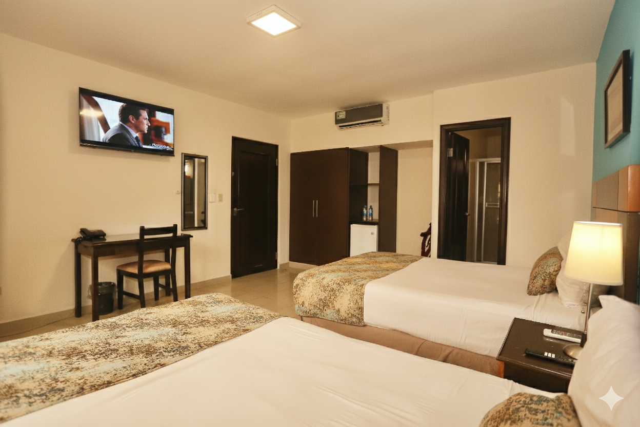 Habitación doble ciudad de Panamá, espaciosa y confortable, cuenta con dos camas dobles que garantizan el descanso de todos los huéspedes. Es la opción perfecta para familias con niños pequeños o grupos de amigos que desean compartir habitación y disfrutar de mayor comodidad. Con un ambiente práctico y acogedor, ofrece el espacio ideal para relajarse juntos después de un día de turismo, compras o actividades en la ciudad, manteniendo siempre la privacidad y el confort necesarios para una estadía placentera.